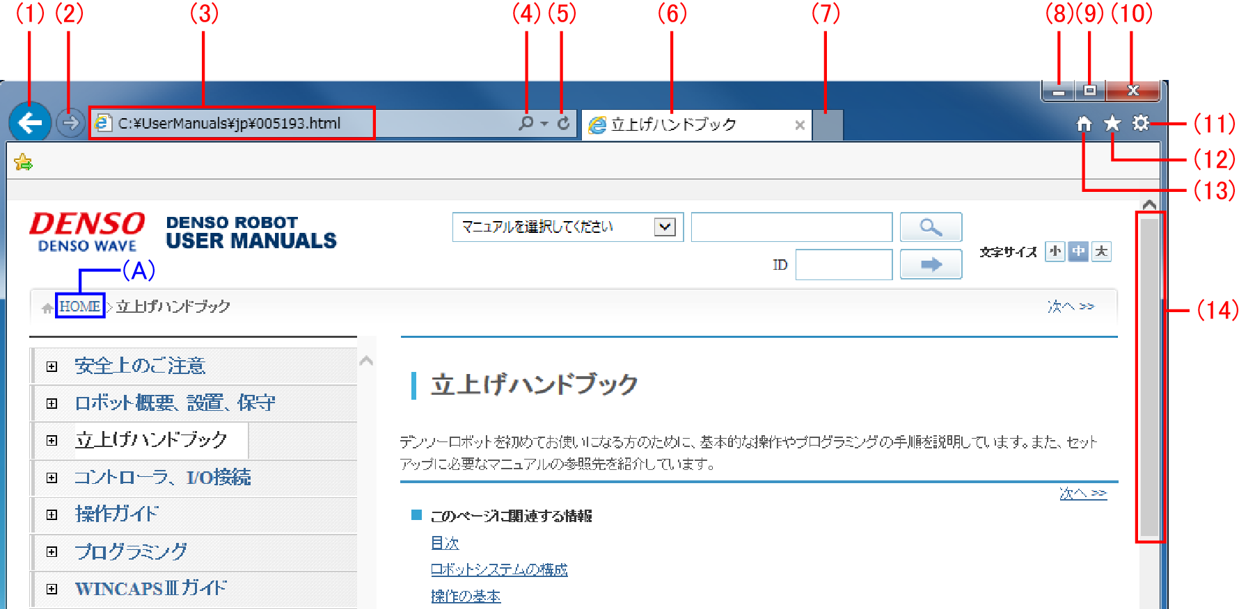 (14) スクロールバー ページが画面に収まらない場合に、ウィンドウの右または下部に表示されます