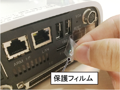 COBOTTAのコネクタパネルのフィールドネットコネクタの保護フィルムをはがします。フィールドネットコネクタの部分以外の保護フィルムは残してください。