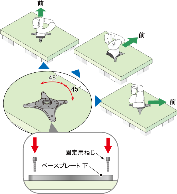 ベースプレート 上を架台にねじで固定する方法と同様に、上から固定用ねじで締め付けることができます。ベースプレート 上だけで架台に固定する場合とは異なり、ベースプレート 上下を固定する際に、COBOTTAの向きを45°刻みで3パターン選ぶことができます。
