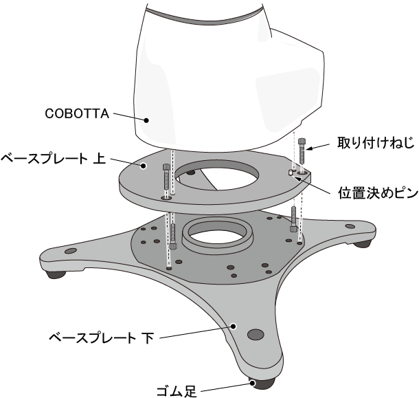 ベースプレート を架台に固定せずに使用する場合は、ゴム足が付いた状態のベースプレート 下を架台に置きます。COBOTTAに取り付けたベースプレート 上を、ベースプレート 下にねじで固定して使用します。