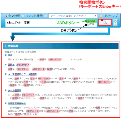 1検索方法を指定します。右の画面では"全文検索"を指定しています。 なお、"IDジャンプ"ではAND/OR検索はできません。 |