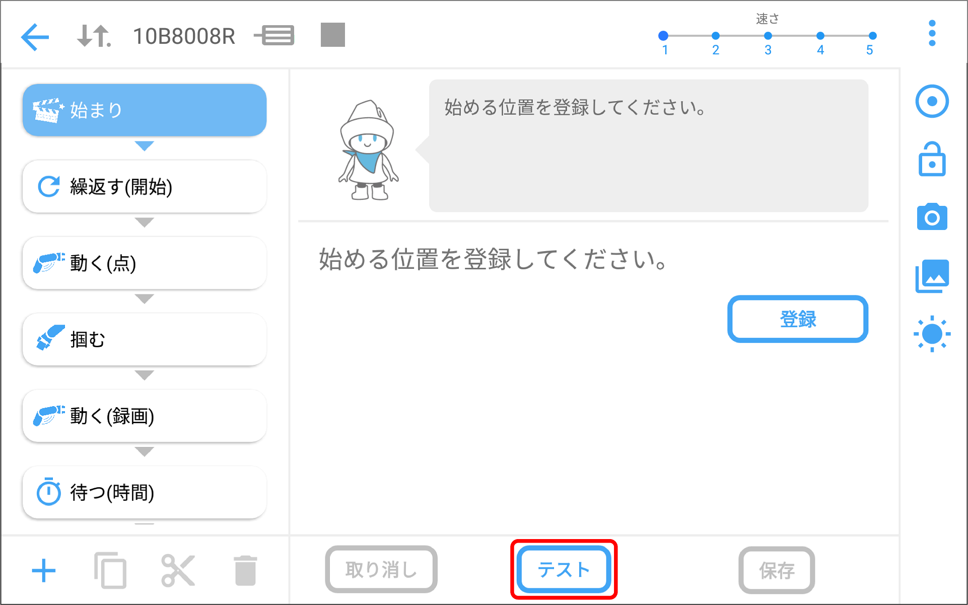 動作系のアイテムをテストする場合は、COBOTTAが動き出しますのでご注意ください。動作テストでは、COBOTTAは最大速度の10%の速度で移動します。