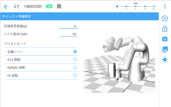 | アシストモード | 全軸フリー | 位置や姿勢を維持し続けてティーチングの調整をアシストします。 全軸フリー : 位置と姿勢を自由に変更できます。 |