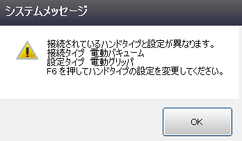 ハンドパラメータの設定と接続されたハンドタイプが異なる場合、COBOTTA起動時にエラーメッセージが表示されます。