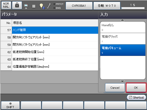 ハンドの種類を[電動バキューム]に変更すると、下記のパラメータが自動で変更されます。