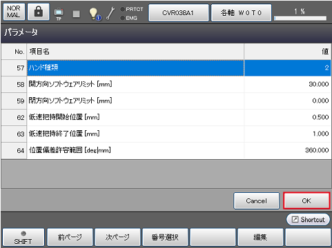 パラメータの変更が成功すると、システムメッセージが表示されますので、[OK]ボタンを押してメッセージを消します。