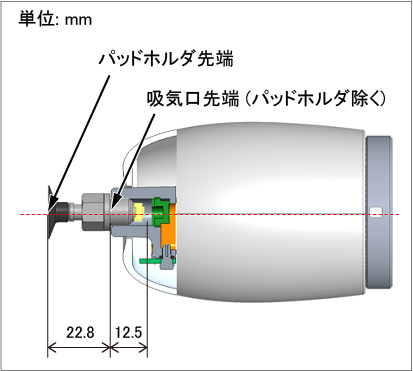 工場出荷時には、吸気口にパッドホルダと真空パッドが取り付けられています。 出荷時に取り付けられているパッドホルダの高さ(吸気口先端からパッド底面までの高さ)は22.8mm です。この場合のツール定義は、以下の値になります。 |