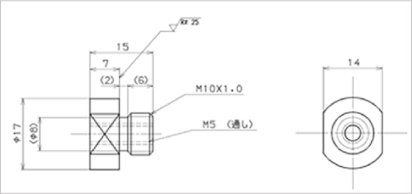 変換アダプタは、以下の図面を参考に制作してください。参考図面ではM10×1.0をM5通し穴に変換しています。