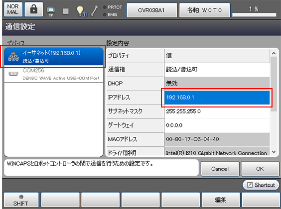 デバイスに"イーサネット"を選択して、COBOTTAのIPアドレスを設定します。