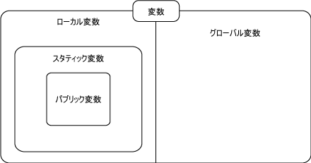 | 変数の名前 | ローカル変数 | スタティック変数 | パブリック変数 | グローバル変数 | ||