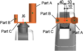 各部品の回転軸からの重心の距離はロボットの図面を参考に算出ください。J5回り、J4回りのイナーシャは該当軸より下位の軸位置によって重心の距離が異なります。最大の距離となる位置で計算してください。