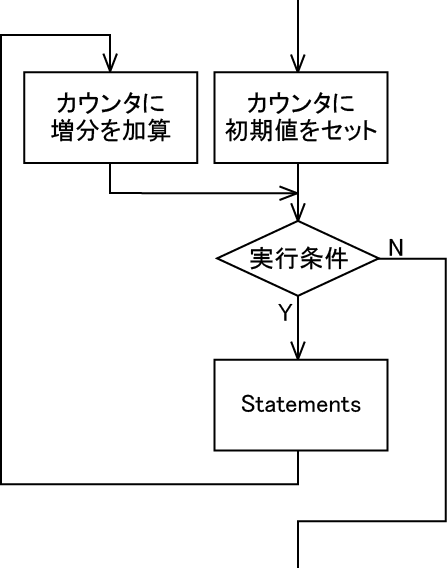 カウンタに指定した変数に初期値を代入し、実行条件を判定します。実行条件が真(True)ならば、指定した一連のステートメントを実行します。一連のステートメントを1回実行するたびにカウンタの変数に増分に指定した値を加算します。