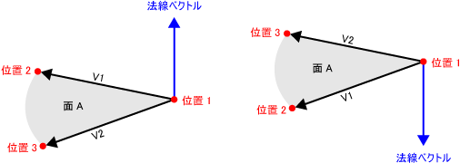 3点を含む面に垂直なベクトル(法線ベクトル)を返します。法線ベクトルの向きはベクトルV1、V2の外積方向になります。上図を参考にしてください。
