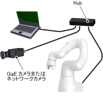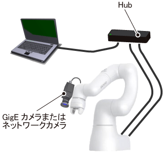 Ethernetコネクタ(本体通信用)は一つですので、Hubを経由して、PCとカメラの両方を接続します。設定、調整終了後は、Hubを外して、Ethernetコネクタ(手先通信用)とEthernetコネクタ(本体通信用)を接続することでカメラを使用することができます。