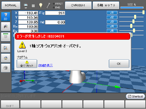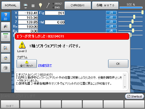 また、エラー処置後、エラーメッセージウィンドウ上のOKボタンを押すことでエラー解除ができます。