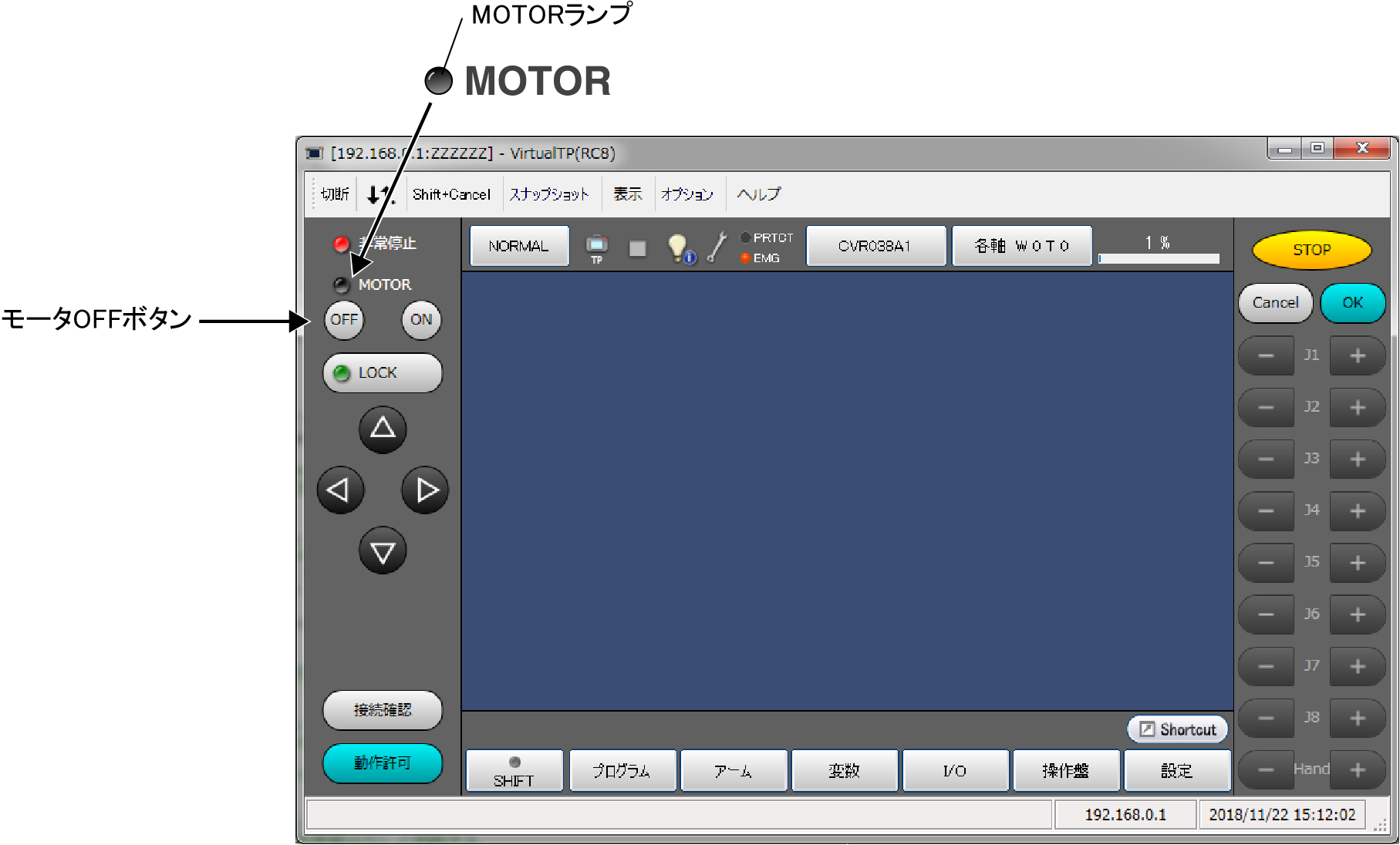 MOTORランプが点灯しているときは、MOTORランプ下の[OFF]を押してモータ電源を切ってください。