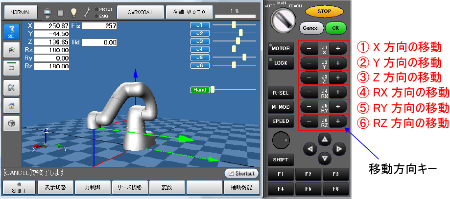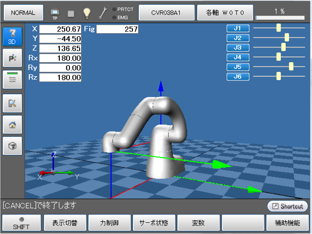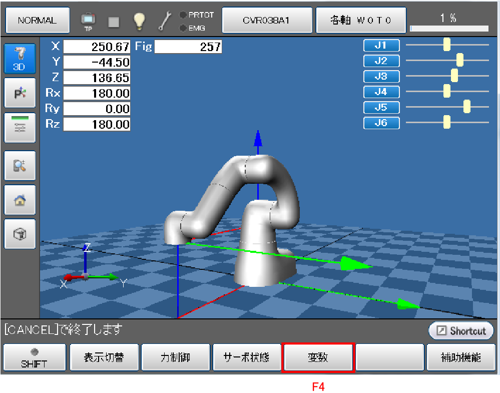 リモートTP/バーチャルTPの初期画面から[F2 アーム]を押すとアームの各軸の情報が表示されます。