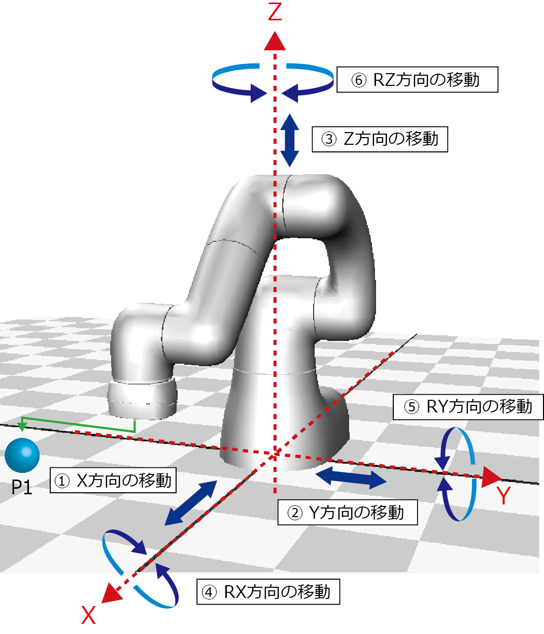 バーチャルTP:キーボードのShiftキー+移動方向キーを適宜押して、P1に設定したい位置までロボットを動かします。