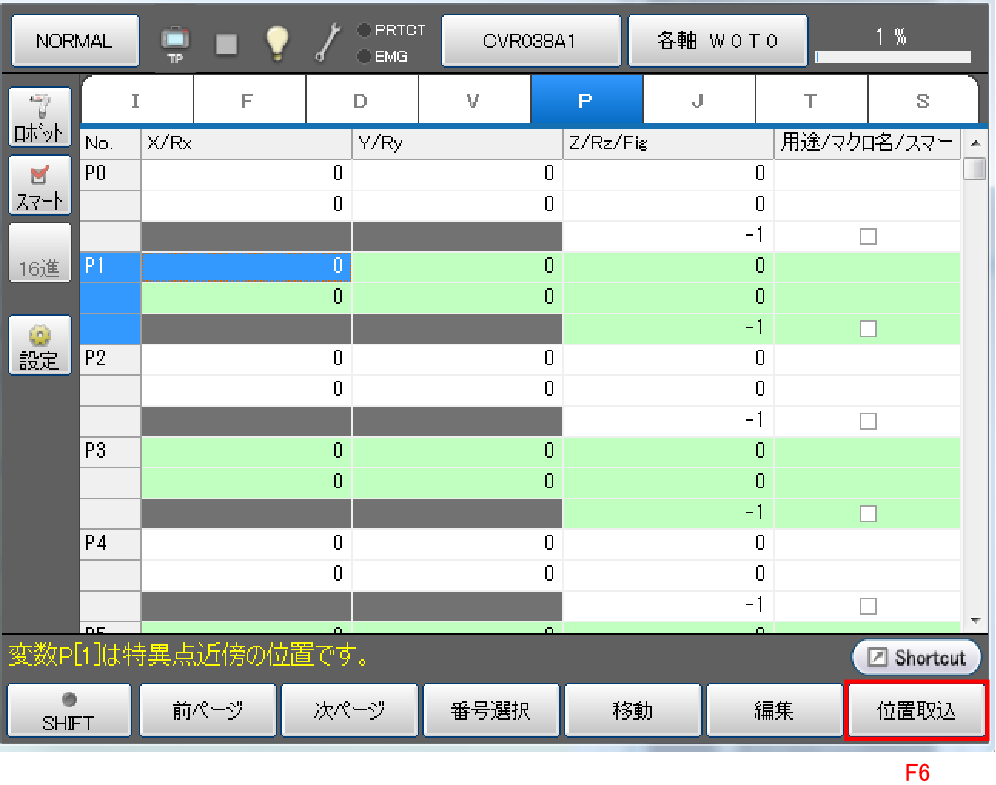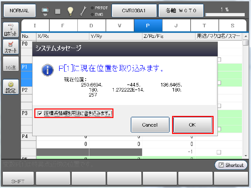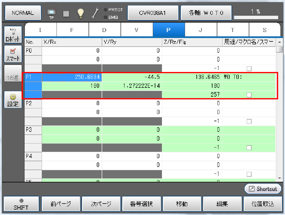 現在位置が変数P1の値として取り込まれます。用途欄には座標系情報(ワーク番号、ツール番号)が書き込まれています。