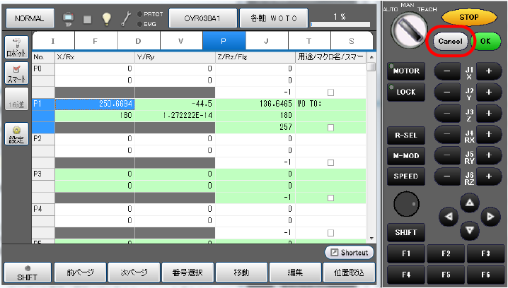 [Cancel]ボタンを1回押して、[ロボット現在位置]ウィンドウに戻します。