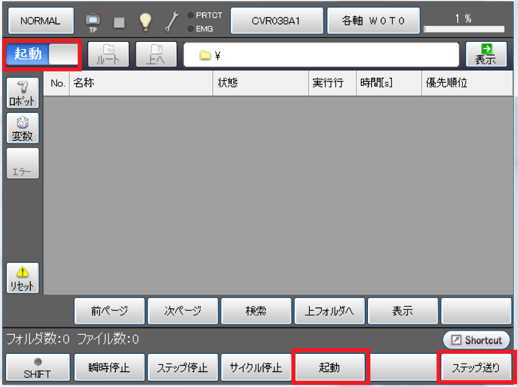 「起動」が表示されている状態で、[F4 起動]または[F6 ステップ送り]を押すと、プログラムの起動ができます。