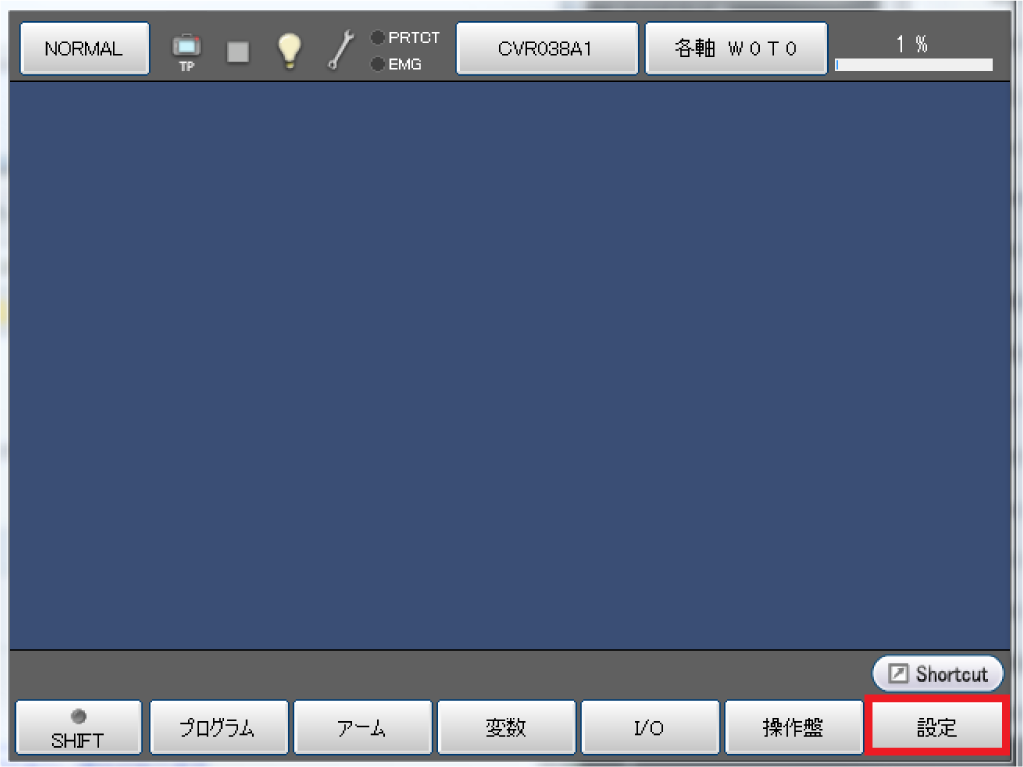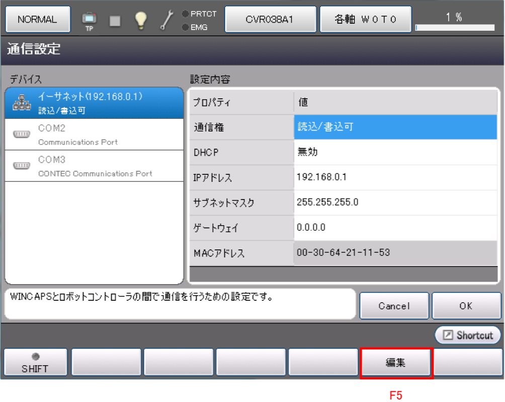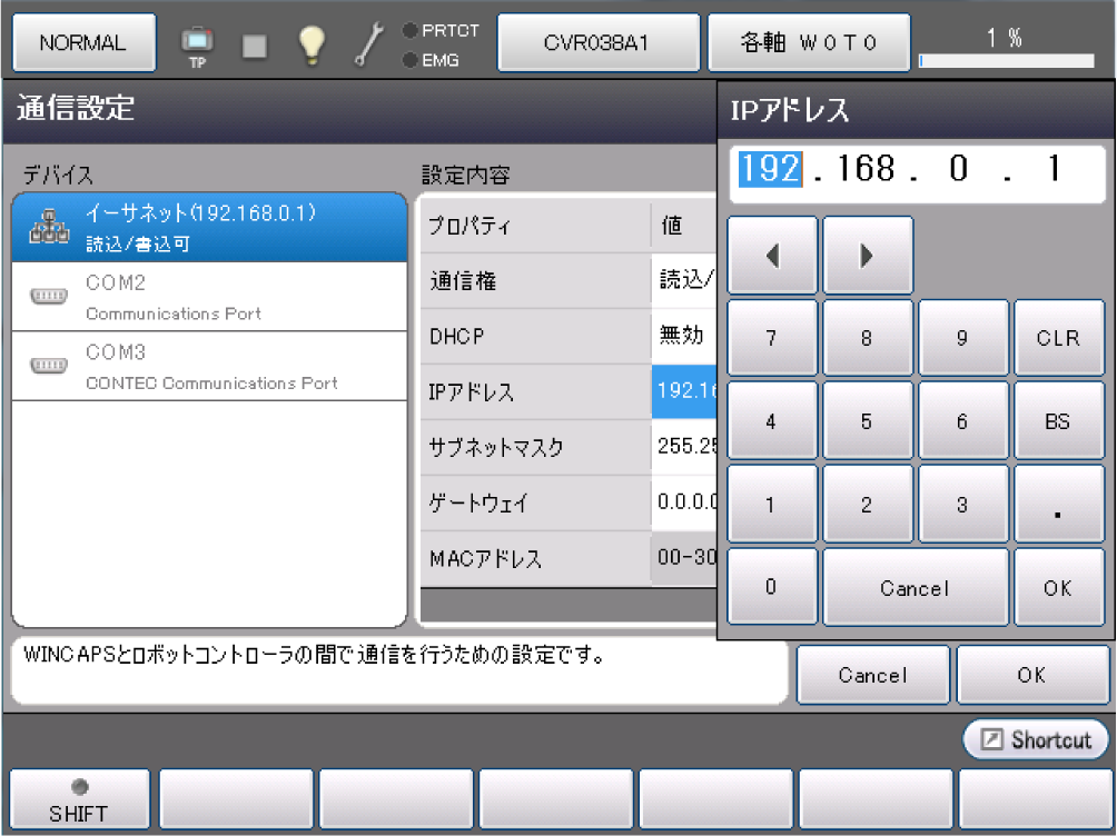 イーサネットでPC(WINCAPSIII)とCOBOTTAが通信できるように、COBOTTAの設定をします。この設定は、リモートTP/バーチャルTPで行ないます。