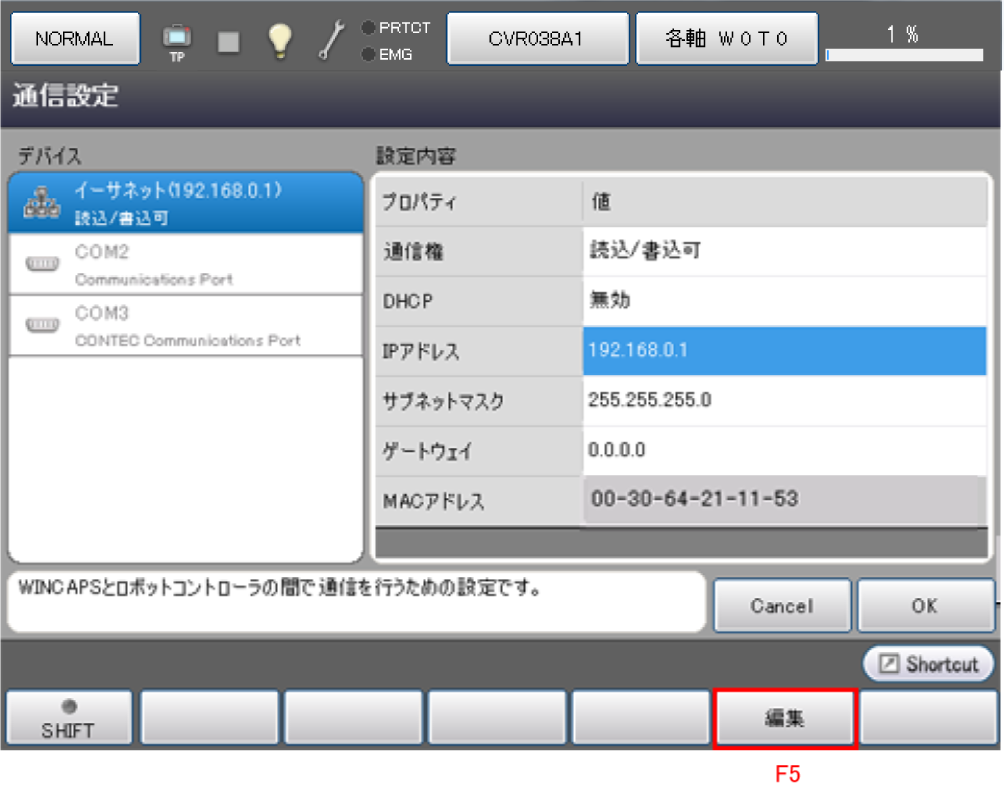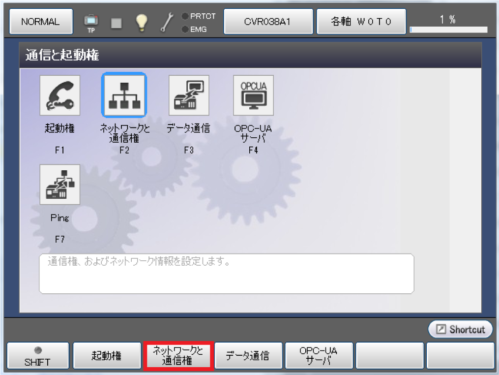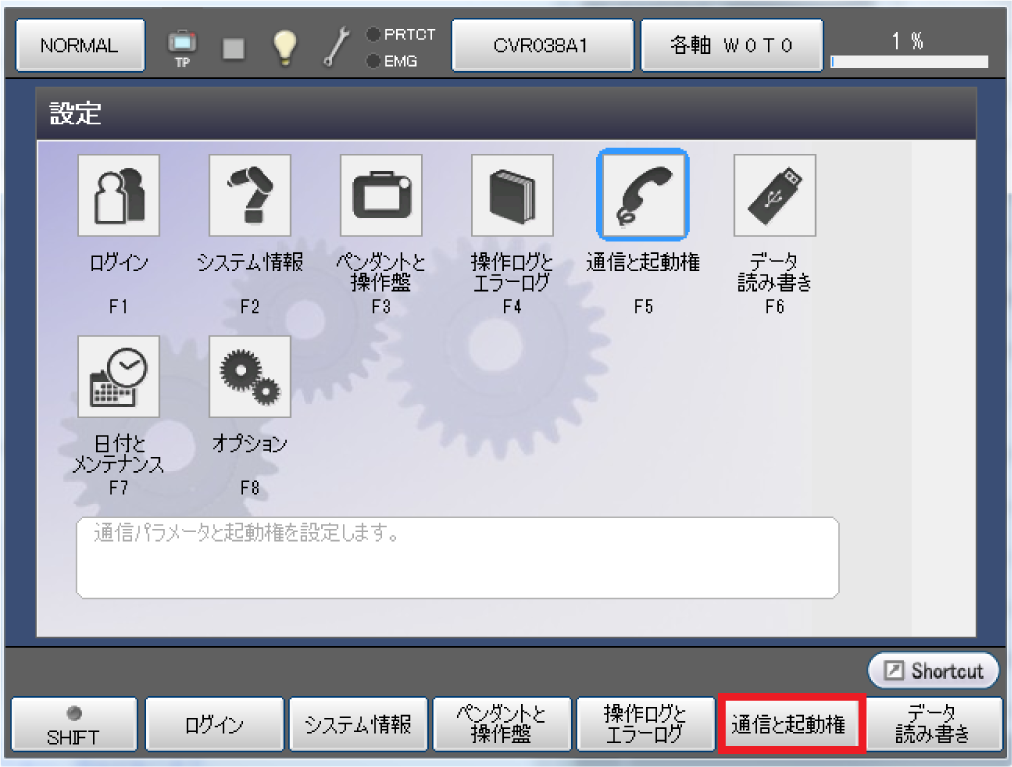 「設定(メイン)」ウィンドウが表示されますので、[F5 通信と起動権]を押します。