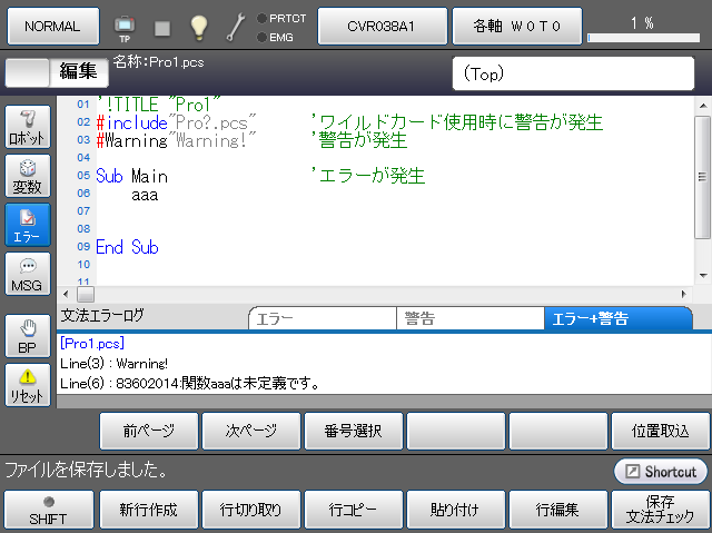 文法エラーログ表示部の上部にあるタブを選択することで「エラー」、「警告」、「エラー+警告」の表示を切り替えることができます。