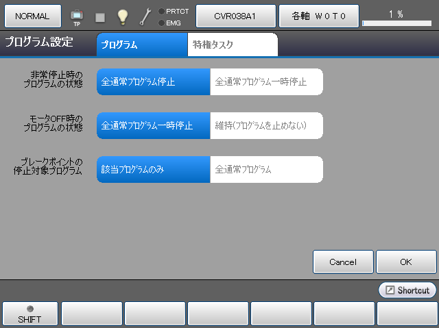 非常停止時に、プログラムを停止させるか、停止させないかの設定を行います。 画面に直接タッチして設定の変更を行います。 選択された部分が反転表示されます。 |