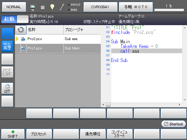 コール元のファイル名(pcs, pns, hファイル)を順に表示します。最下段が最初のコール元で、矢印の表示されているファイル名が現在実行中のファイルです。ファイル名をタッチすると、そのファイルのソースコードが右側に表示されます。