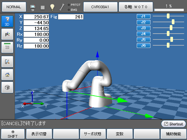 ロボットの現在位置情報の表示方法を変更します。 選択できる表示は、「P型表示」、「J型表示」、「T型表示」、「表示なし」の4種類で、ボタンを押すごとに切り替わっていきます。 |
