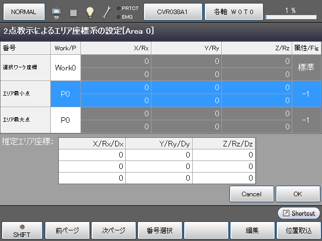 [F4 簡単教示]を押すと、次のような[2点教示によるエリア座標系の設定]ウィンドウが表示されます。