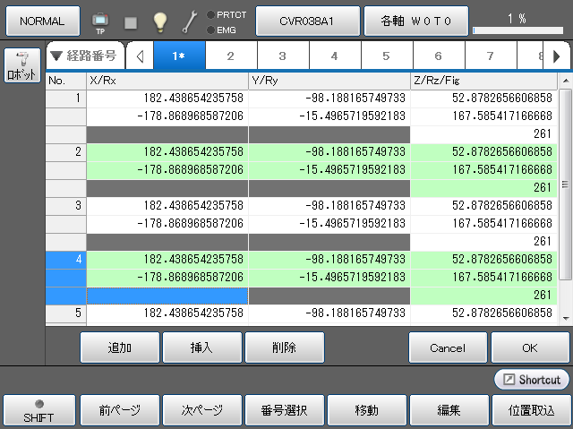 コピーした経路点の値を貼り付けます。 貼り付けをしたい経路点番号を選択し、[貼り付け]を押すと、貼り付けができます。 |