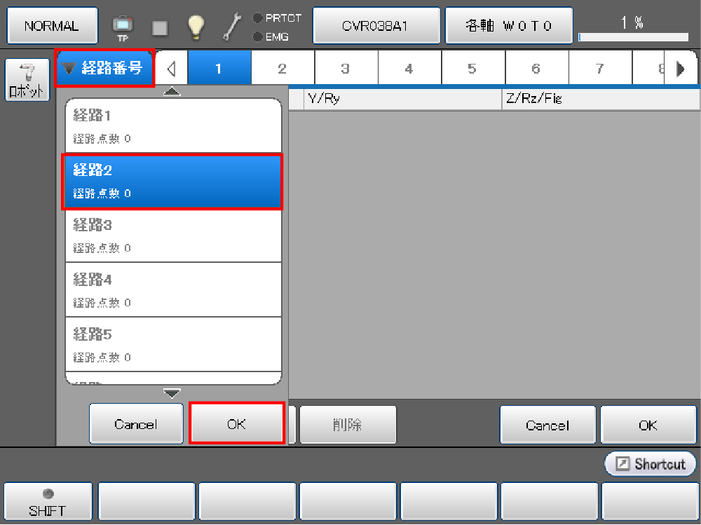 「経路点設定画面」が表示されますので、[経路番号]を押して、リストの中から設定する経路番号を選択し、[OK]を押します。