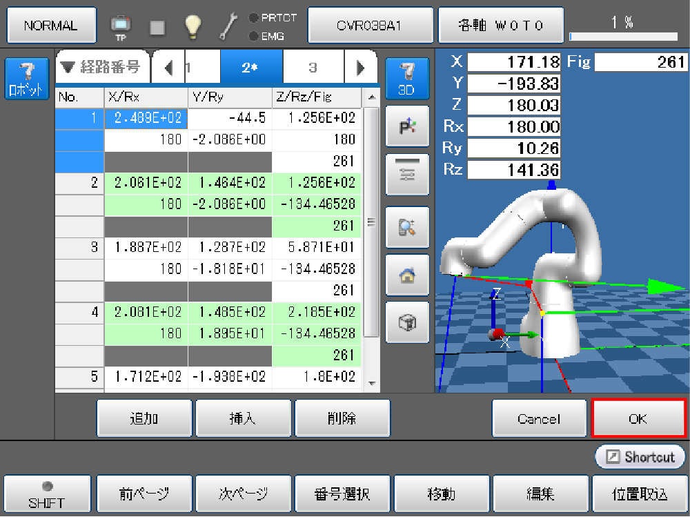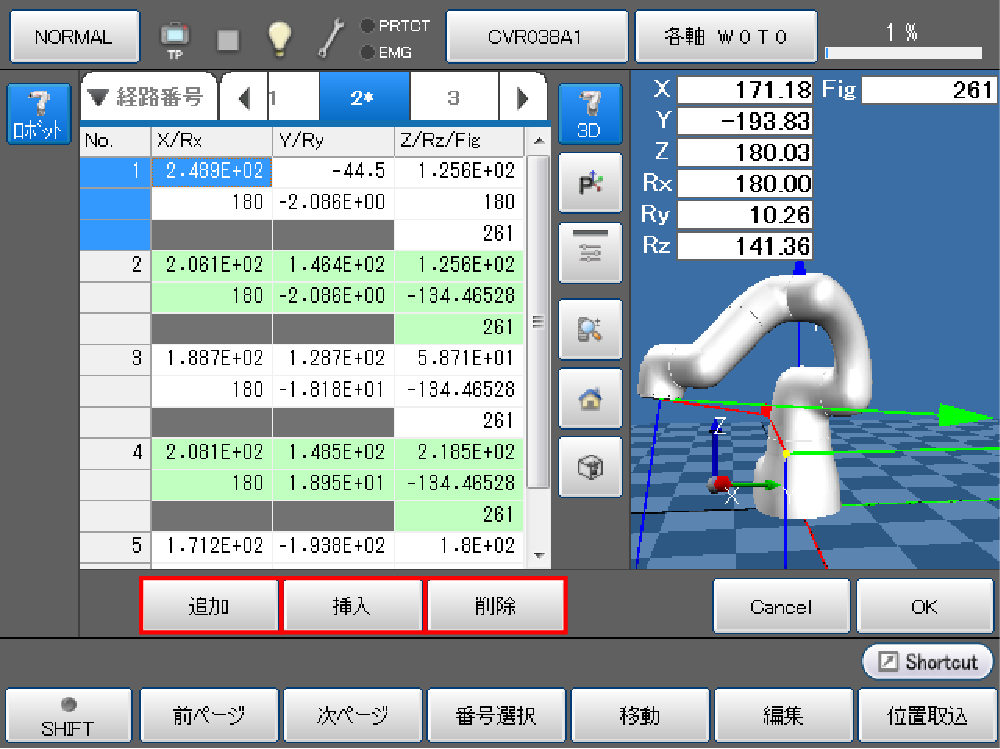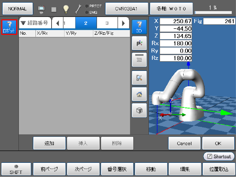 基本画面 - [F2 アーム] - [F6 補助機能] - [F6 経路点]を押します。