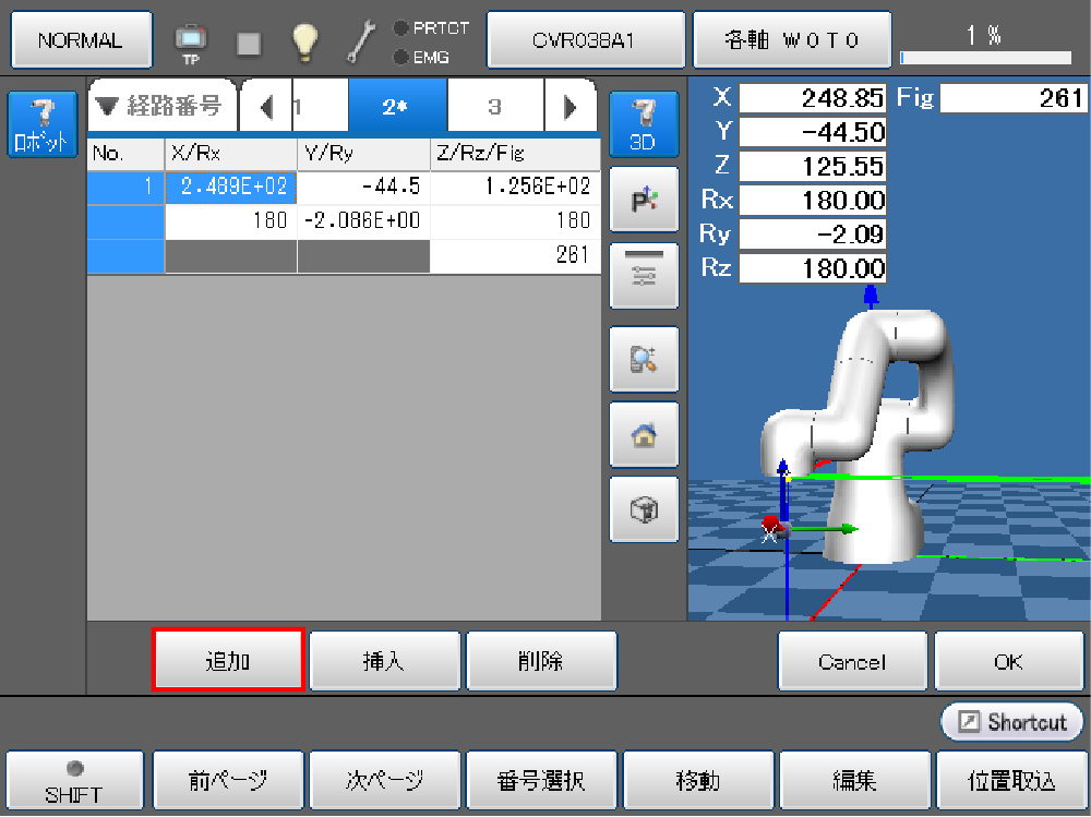 ロボットをねらいの位置まで移動し、[追加]を押して、ロボットの現在位置を取り込みます。