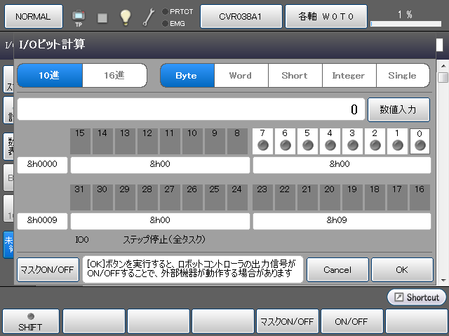 テンキーが表示されます。 テンキーを使用してビット計算値を入力し、[OK]を押すと、入力した値に相当するビットがONします。 |