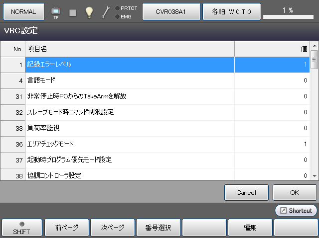| [F5 編集] | 変更したいパラメータを選択し、[編集]を押すと入力画面が表示されます。項目を選択し、入力画面上の[OK]を押すと、内容が変更されます。 変更した値は、[VRC設定]ウィンドウの[OK]を押すことで確定します。 |