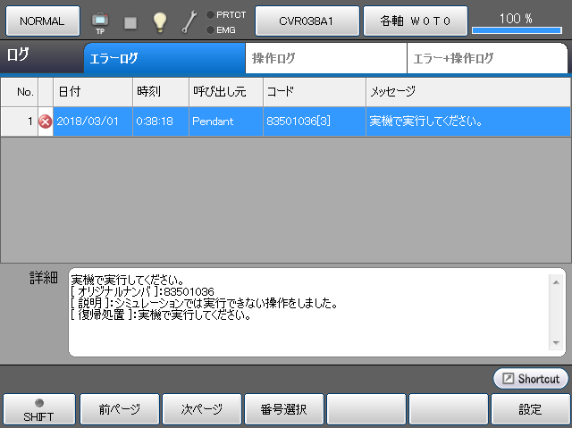 [ログ]ウィンドウ内の「エラーログ」、「操作ログ」、「エラー+操作ログ」のそれぞれのタブを選択することで表示内容を切り替えることができます。