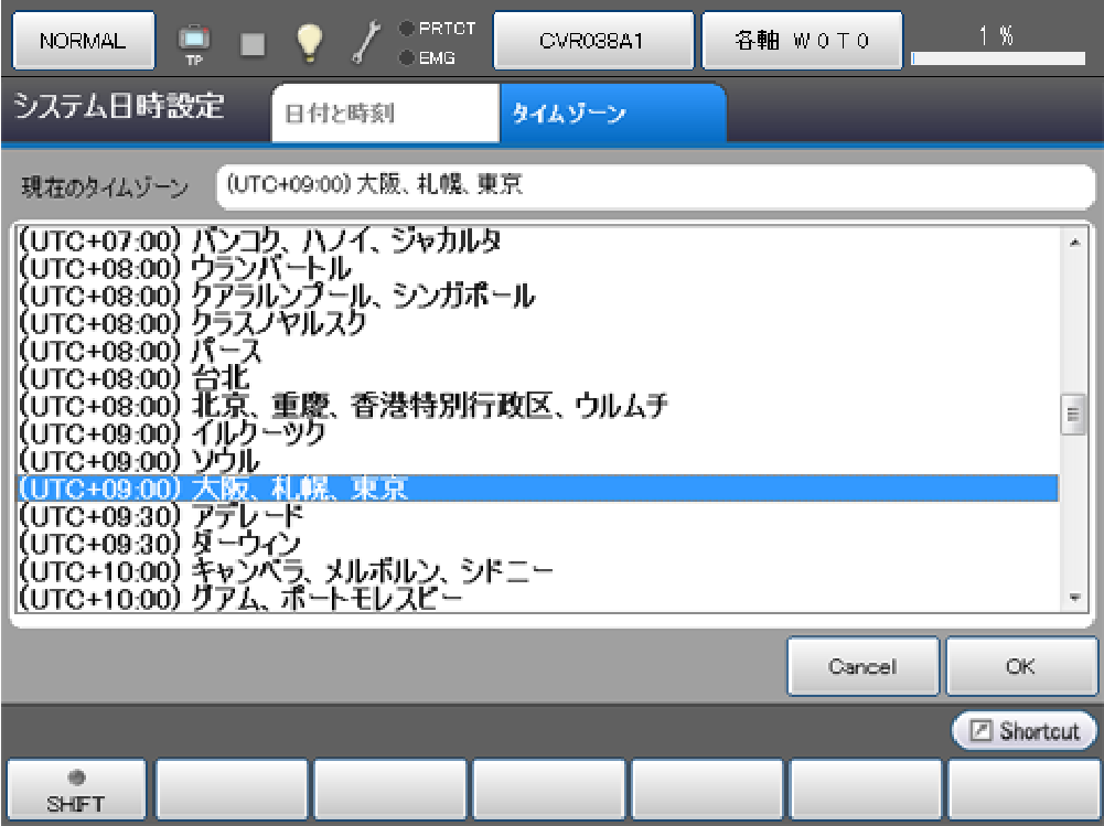リモートTP/バーチャルTPの上下方向カーソルキーを使用して設定するタイムゾーンを表示・選択します。 選択後、[OK]を押すとタイムゾーンが設定されます。