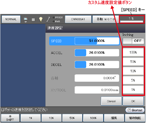 - カスタム速度設定値の表示・変更