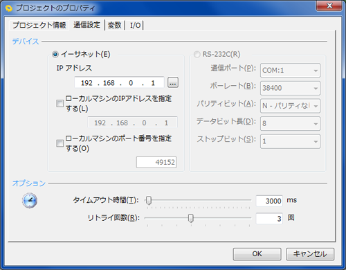 「プロジェクトのプロパティ」ダイアログの「通信設定」タブが選択された状態の画面が表示されます。