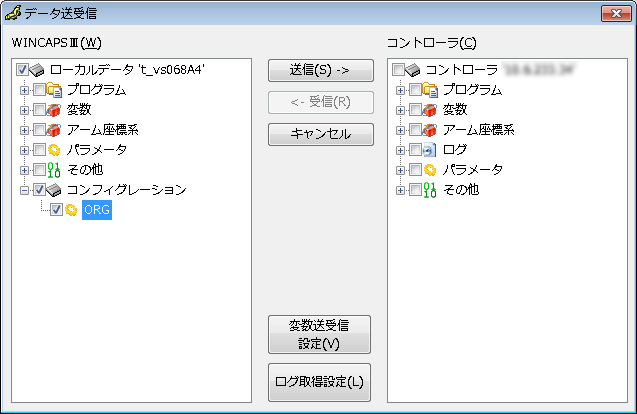 変数、アーム座標系の送受信対象を選択します。デフォルト(通常)は、値、用途、マクロ名の全てを送受信します。 - ログ取得設定