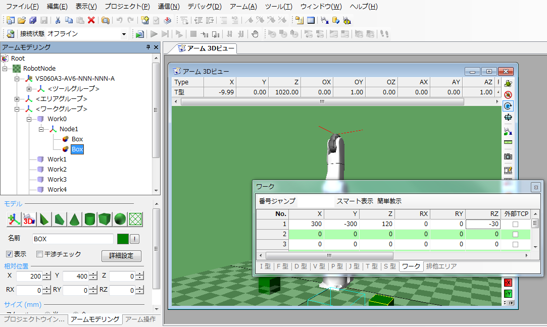 簡易モデリング機能は、「アーム3Dビュー」にパレット台やパレット、ワークなどのオブジェクトを配置します。