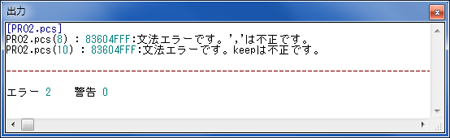 プログラム内に文法エラーが見つかった場合は、「出力」ウィンドウにエラーが発生している行番号、およびエラー内容が表示されます。