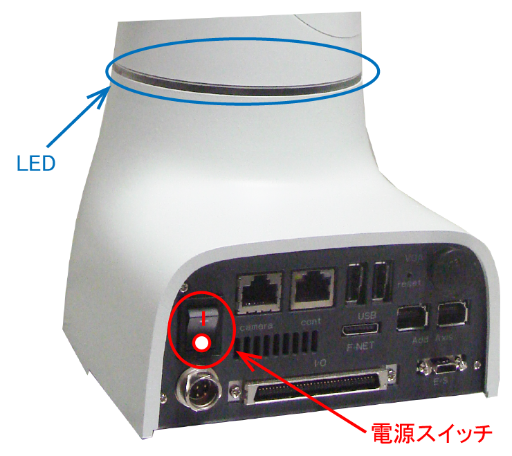 電源入りの状態ではCOBOTTA本体のLEDが点灯しています。電源を切るとLEDは消灯します。