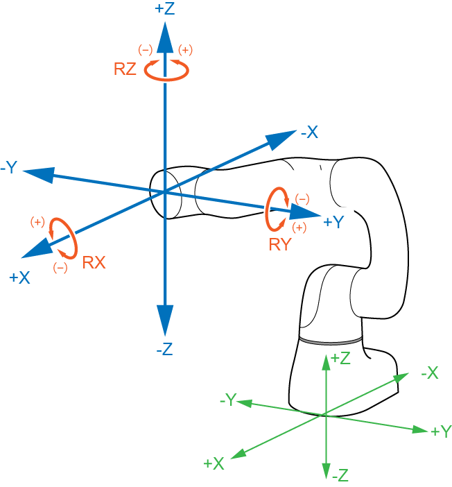 X-Yモードでは、ロボットアームをベース座標系(原点がロボット基部の中心に設定されている)を基準にして動かすことができます。X-Yモードで[X]キー、[Y]キー、または[Z]キーを操作すると、以下に示すように、ロボットフランジがそれぞれX軸、Y軸、またはZ軸に沿って直線動作します。