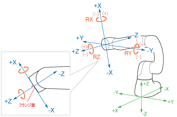 TOOLモードでは、メカニカルインタフェース座標系(原点がフランジ面中心に設定されている)、すなわちツール座標系を基準にしてロボットを動かすことができます。