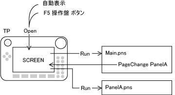 はじめに表示する操作盤ファイルは必ずルート(Source Files)内の"Main.pns"です。操作盤タスク内にPageChangeステートメントを記述して他の操作盤ファイルに表示を切り替えることができます。