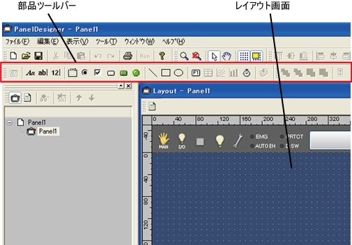 PanelDesignerに準備されている[部品ツールバー]から必要な部品を指定し、レイアウト画面上に配置して操作盤の画面を作成します。詳細は「レイアウトを作成・変更する」を参照してください。